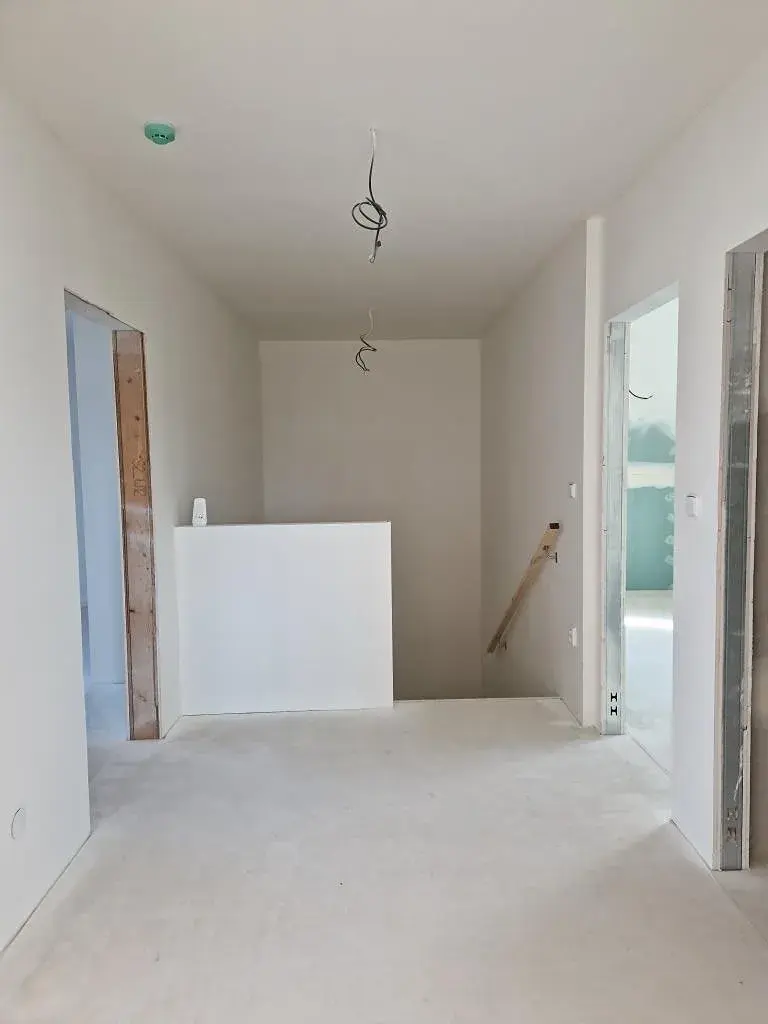 finální povrch podlah (nyní broušený anhydrid), obklady, sanita (vana, umyvadlo, WC), parapety, zárubně, interiérové dveře.