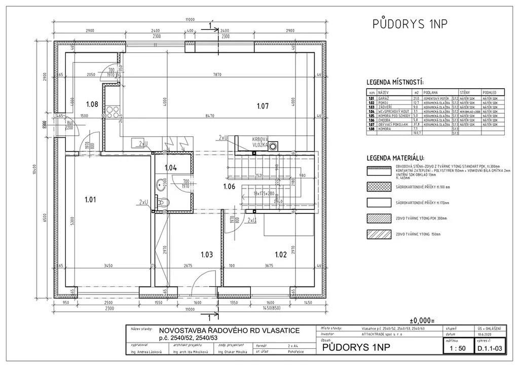 Přízemí (103,7 m2): garáž 21 m2 s umyvadlem, odvětráním, alarm pomocí magnetu na dveřích, zádveří 9 m2, pokoj 12,7 m2, WC se sprchovým koutem a umyvadlem 3,1 m2, komora – technická místnost pod schody 5 m2, chodba 5,8 m2, obývací pokoj s kuchyňským koutem 37,8 m2, komora 7,1 m2 přístupná z garáže, kuchyně a zahrady se samostatným rozvodem elektřiny pro zahradu.
