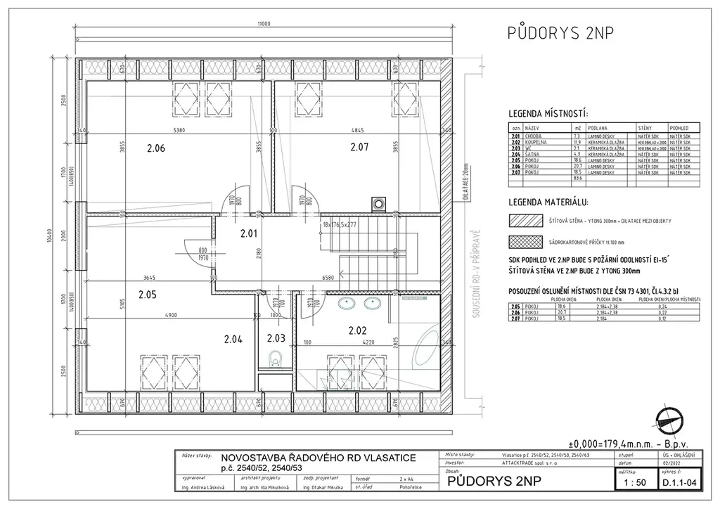 1.patro (83,6 m2): chodba 7,3 m2, koupelna 11,9 m2 – připraveno na: vanu, sprchovým kout (box), 2 umyvadla, vývod na pračku a sušičku, samostatné WC s umyvadlem 2,1 m2, 2x pokoj 23 m2, 20,7 m2 se střešními okny a klasickým oknem ve štítové zdi a 1x pokoj 18,5 m2 pouze se střešními okny.