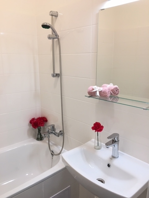 Byt má vyzděné jádro, podlahy, rozvody, omítky, interiérové dveře. Koupelna s vanou a umyvadlem s místem pro připojením pračky, toaleta je odděleně.