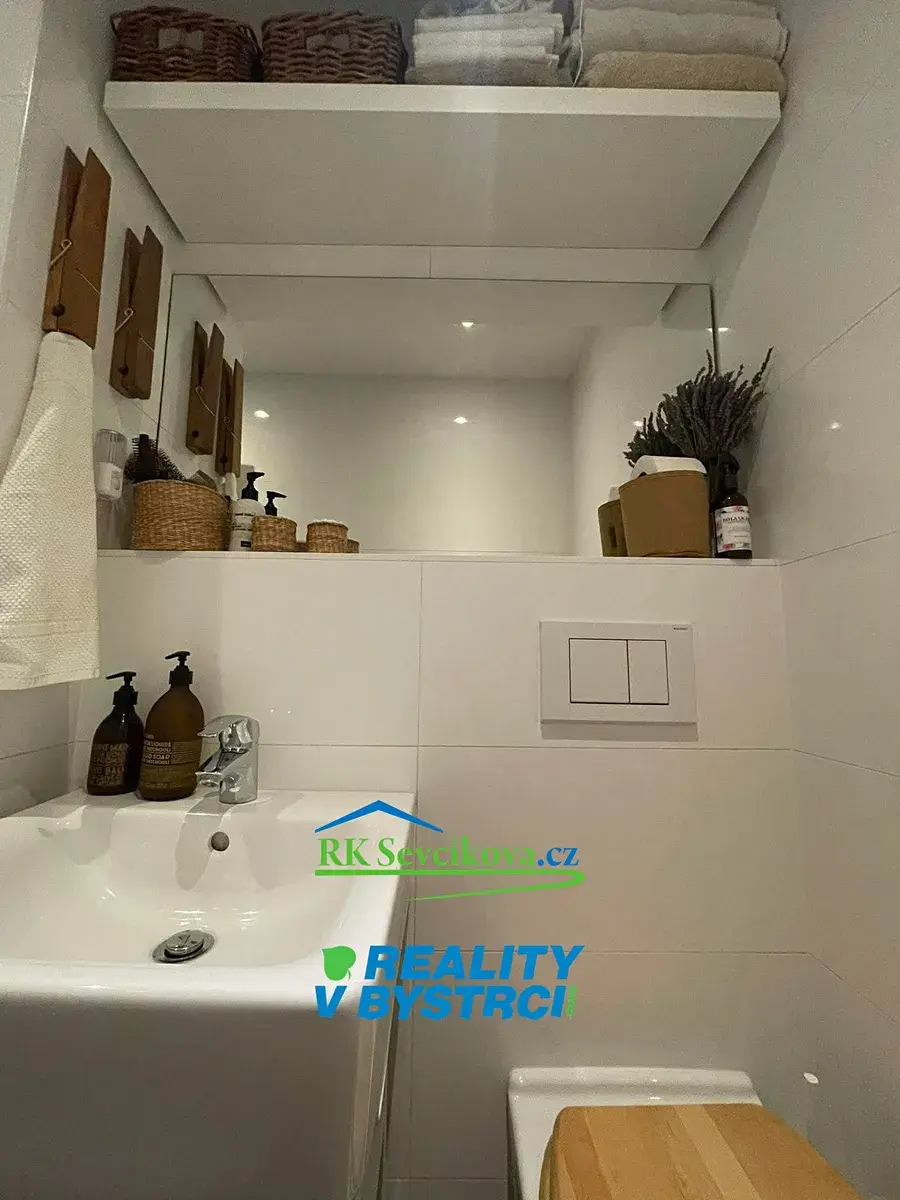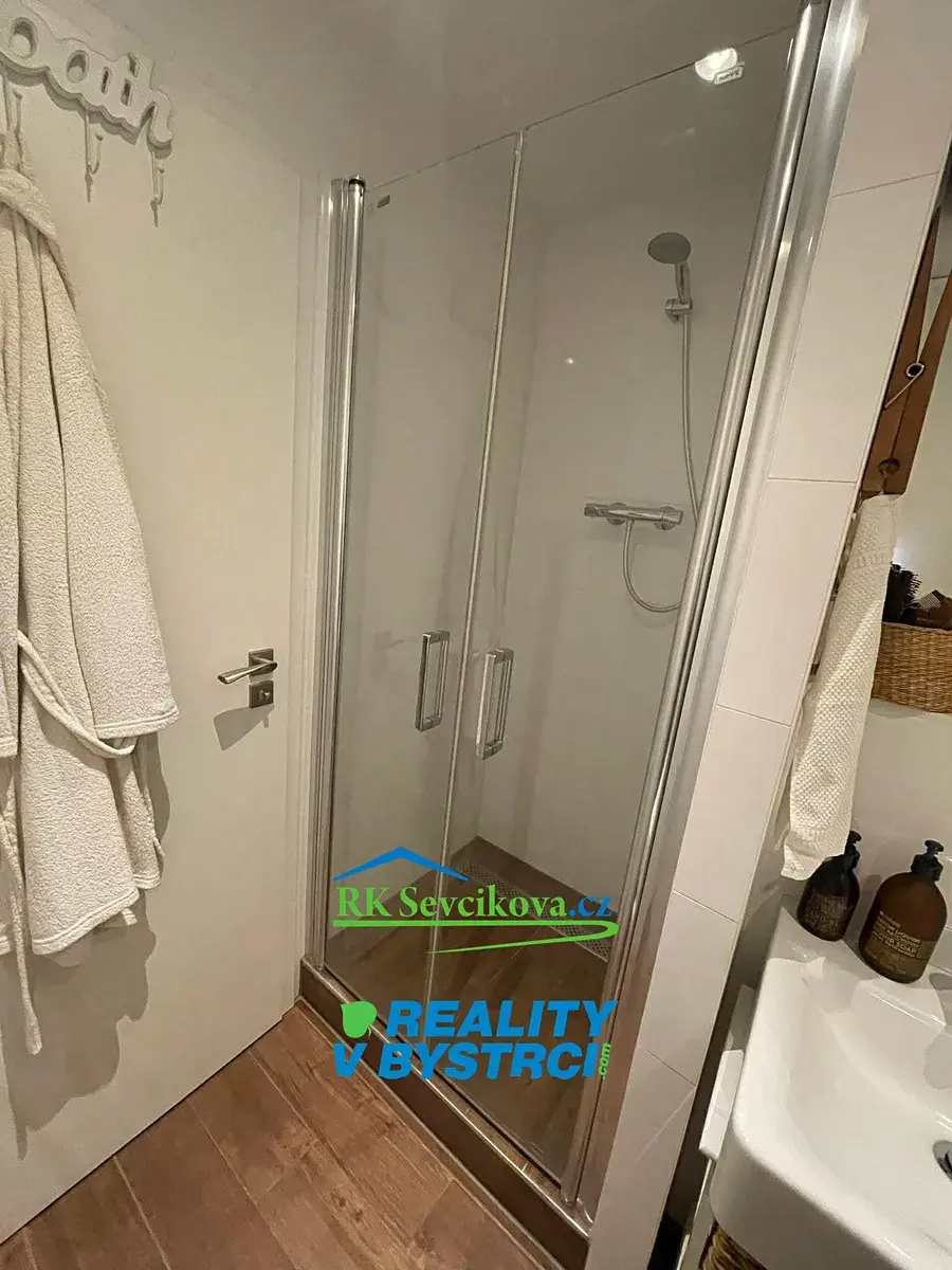 Koupelna je vybavena sprchovým koutem, toaletou a úložnými skříňkami. Součástí bytu je také vestavěná komora, ideální k uložení věcí, například kola. K bytu náleží lodžie o velikosti 4,42 m², která nabízí příjemné místo k posezení.