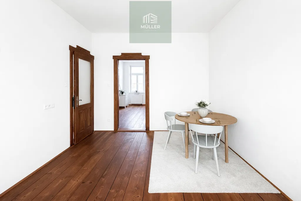 Velkou předností bytu je zachování původních prvků z období kolem roku 1930, zejména zrepasované přibližně 100leté dřevěné podlahy a původní dřevěné dveře, které dodávají interiéru jedinečný charakter a nadčasový styl.
