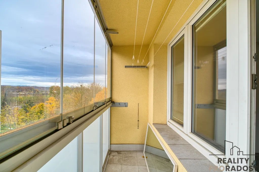 Interiér bytu se skládá z hlavního pokoje s kuchyňským koutem, koupelnou s toaletou a chodbou. Z pokoje je výstup na zasklenou lodžii. K dispozici sklepní kóje.
