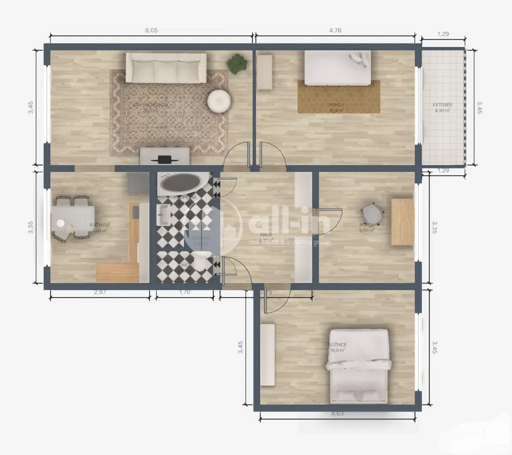 _ Dispozice: 4 samostatné pokoje + kuchyň