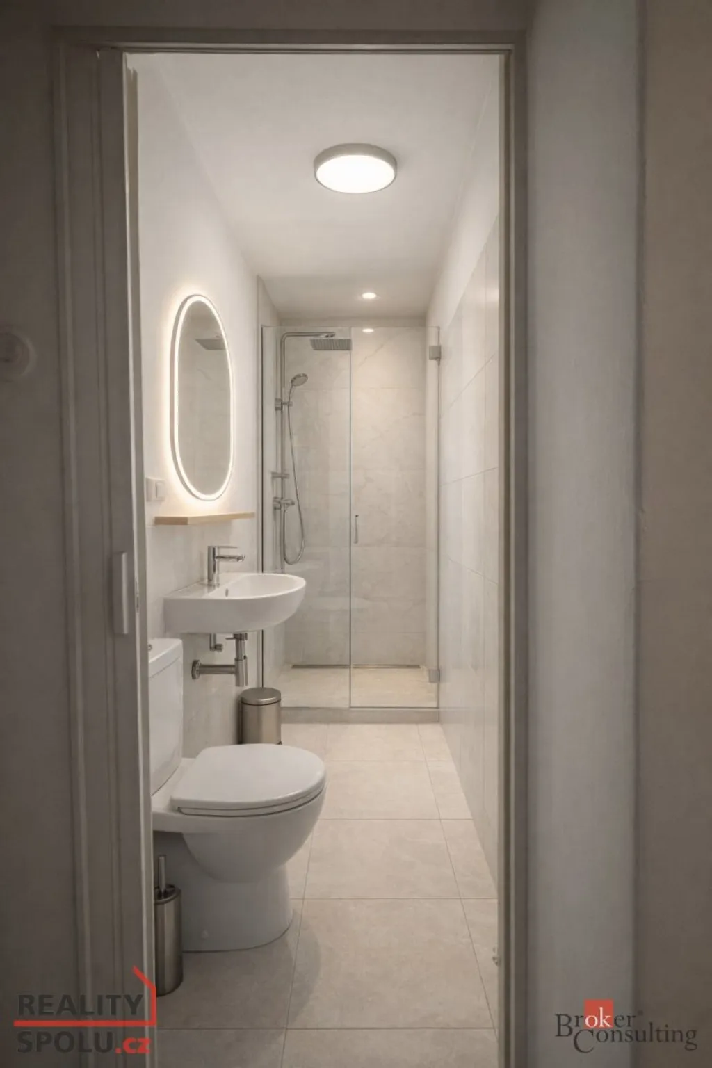 Dispozičně je byt rozdělen na kuchyň s oknem do vnitrobloku, obývací pokoj s výhledem do ulice, předsíň a koupelnu. V obývacím pokoji je díky vysokému stropu vytvořen praktický prostor pro spaní. Koupelna je vybavena sprchovým koutem a toaletou. K bytu náleží sklepní kóje. Byt je v původním stavu a představuje ideální příležitost vytvořit si bydlení dle vlastních představ. Interiérové fotografie jsou ilustrativní.