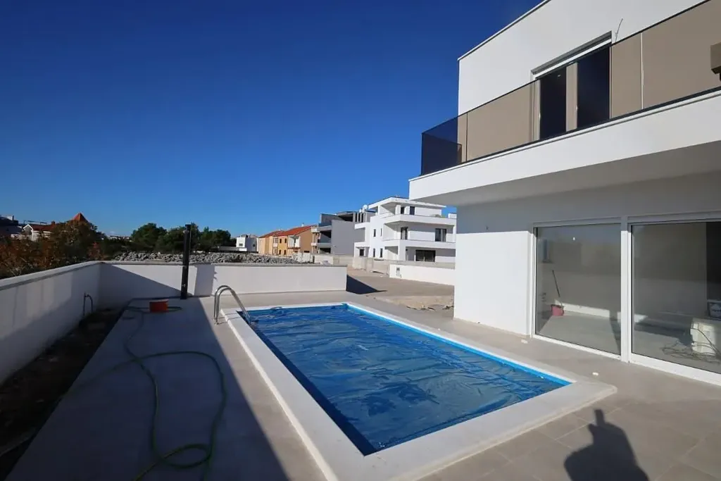 Dovolujeme si Vám nabídnout nový řadový atraktivní dům s bazénem v obci Srima v Šibenické oblasti v Chorvatsku. Dvoupodlažní dům o ploše 144,65 m2 stojí na pozemku o rozloze 119,61 m2 a tvoří polovinu dvojdomku. Plánovaný termín dokončení výstavby připadá na konec roku 2023.