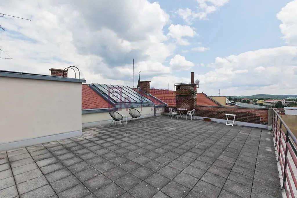 Byt je orientovaný na západní stranu s oknem do dvora a skládá se z jednoho pokoje s kuchyňským koutem a koupelny se sprchovým koutem a toaletou. Na střeše domu (4. patro) se nachází velká terasa s výhledem na zámek, která je k dispozici všem nájemníkům.