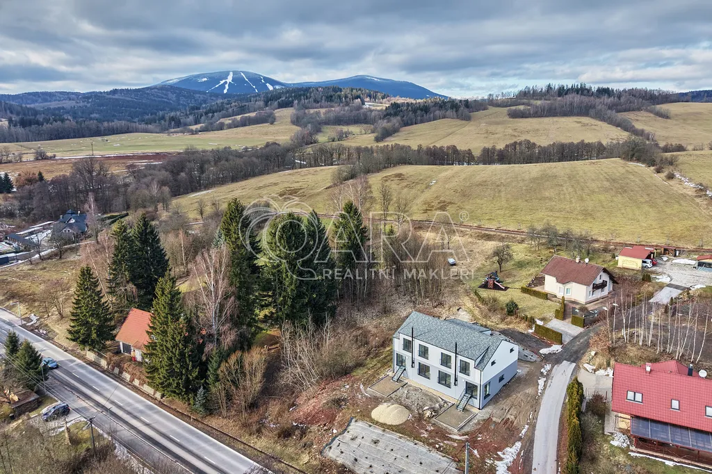 Nabízíme k prodeji moderní rodinný dům s dvěma bytovými jednotkami o dispozici 2x 4kk a celkové ploše jednoho mezonetového apartmánu 132m² v klidné části obce Hertvíkovice, která je součástí oblíbeného horského městečka Mladé Buky.
