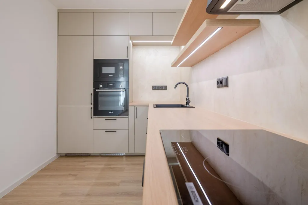Kuchyňská linka disponuje velkou pracovní plochou s osvětlením a vestavěnými spotřebiči Bosch (pečící trouba, mikrovlnná trouba, indukční varná deska), Ikea (lednice, mrazák, myčka), designovou digestoří Franke a je doladěna atraktivní, dobře udržovatelnou stěrkou. Koupelna je obložena působivými velkoformátovými obklady a vybavena vanou, umyvadlem se skříňkou, zrcadlem, topným žebříkem a přípojkou na pračku a sušičku. Toaleta je samostatná, s bidetovou sprškou. Nová okna s izolačním dvojsklem a žaluziemi jsou orientována na západní stranu, do korun vzrostlých stromů. K bytu náleží zděná sklepní kóje (1,15 m2) umístěná v přízemí. V domě je také k užívání kolárna.