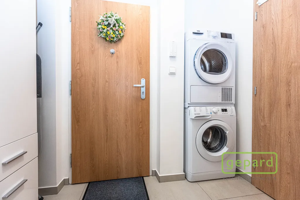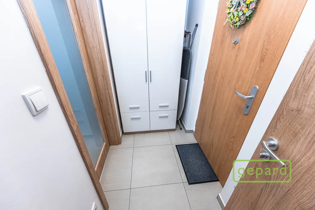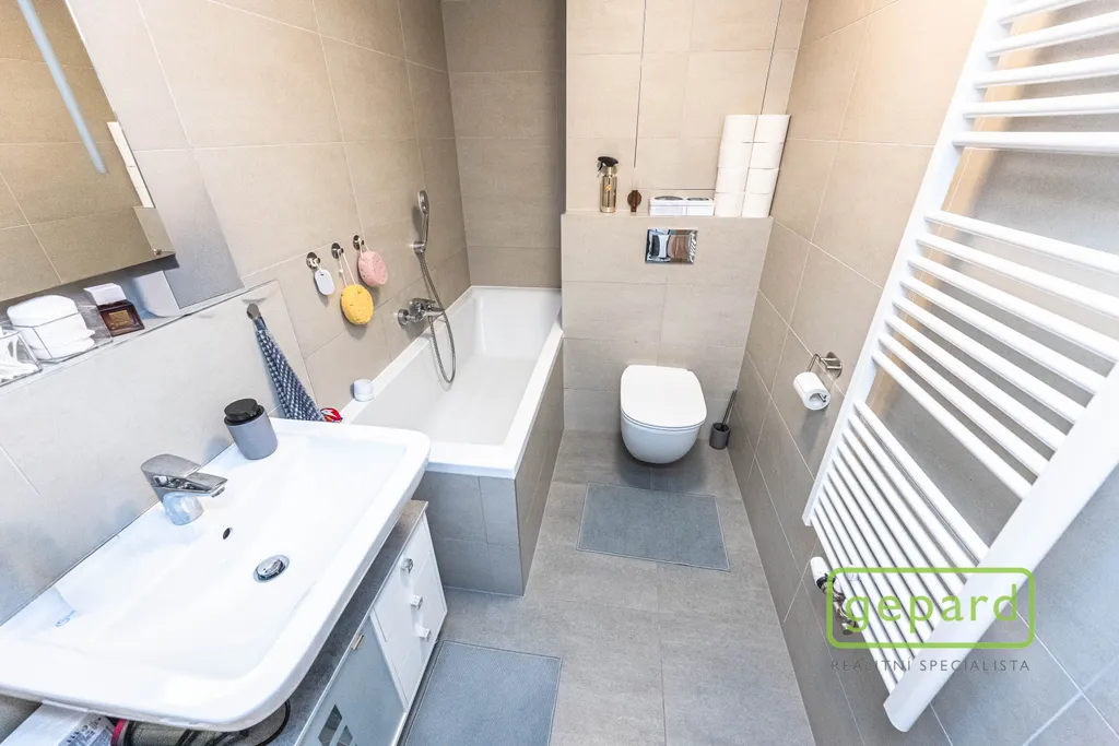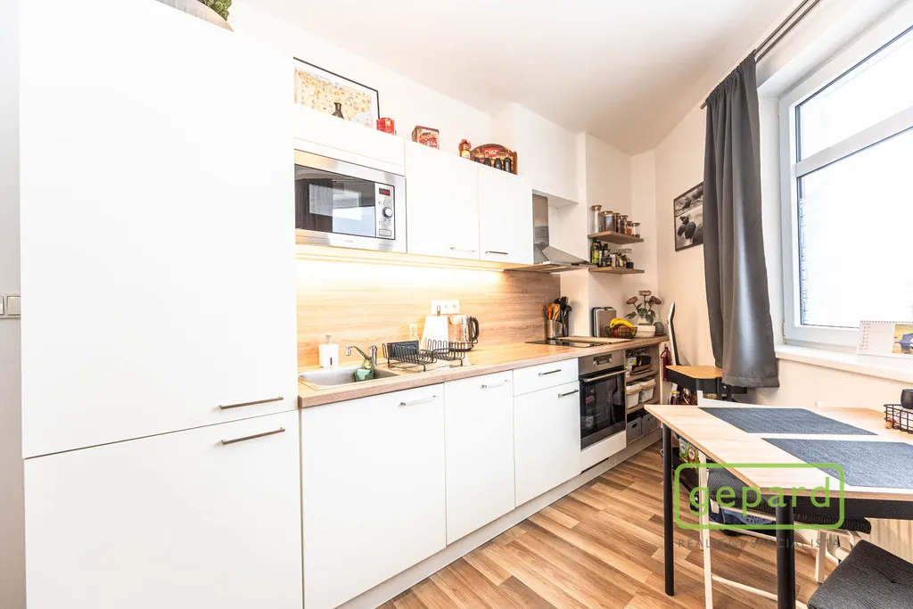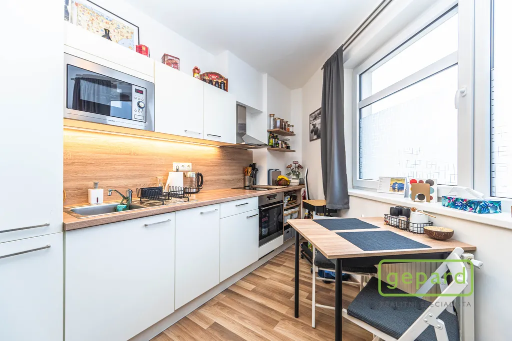 Bytová jednotka se nachází ve 4. nadzemním podlaží bytového domu s výtahem. Byt je vybaven kuchyňskou linkou s vestavěnými spotřebiči: lednicí s mrazákem, elektrickou troubou, varnou deskou, digestoří a mikrovlnnou troubou. V koupelně je vana, umyvadlo se zrcadlem a skříňkou a toaleta. V předsíni je skříň a pračka. V bytě může být po dohodě se současným nájemcem ponecháno i další vybavení: postel (bez matrace), poličky, stolek pod TV, šatní skříň, jídelní stůl a dvě židle. Okna směřují na jihovýchod.