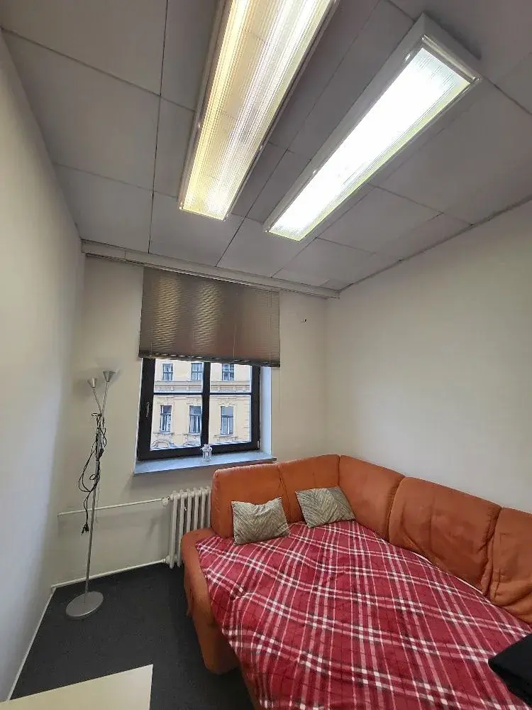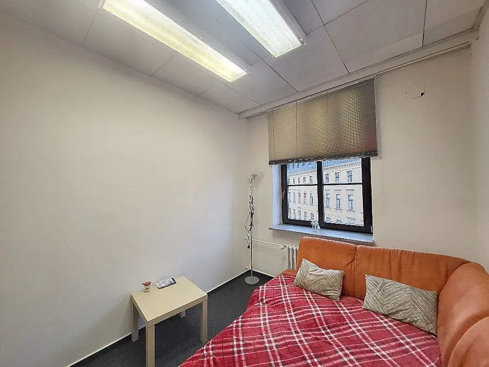 Prostor tvoří jedna menší kancelář. Kancelář je vymalovaná na bílo, na podlaze je položen koberec. Vybavení kanceláře není součástí nájmu.