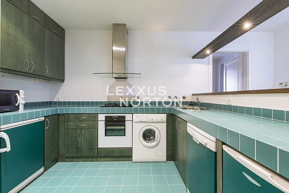 Byt je kompletně zařízený, vybavený sklokeramickou varnou deskou, troubou, lednicí s mrazákem, mikrovlnnou troubou a myčkou nádobí. Obě koupelny disponují vanou. Součástí vybavení jsou také vestavěné skříně a pračka se sušičkou.