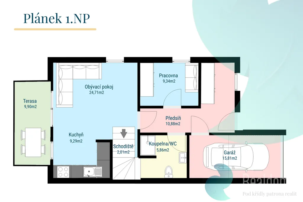 - Průchozí garáž přímo do domu – pohodlí při nákupech i v nepříznivém počasí.