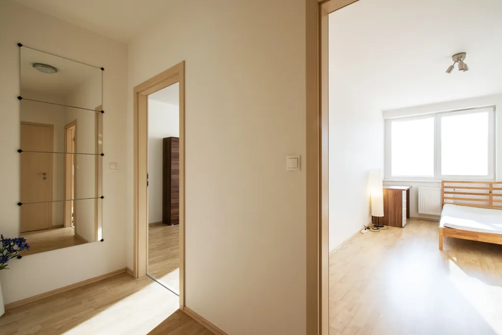 Byt je vybavený moderní kuchyňskou linkou s troubou se sklokeramickou deskou, lednicí a myčkou. V obývací části se nachází obývací stěna. Gauč nebude součástí. Dále je zde samostatný pokoj s manželskou postelí a prostornou skříní. V koupelně se nachází vana a WC.