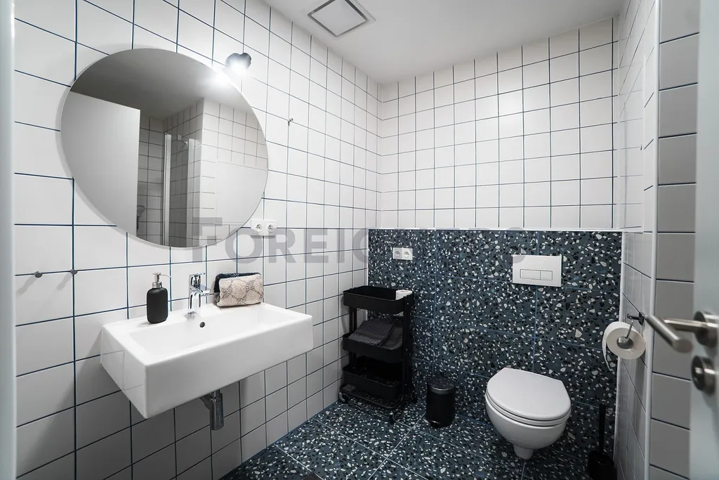 Kuchyňská linka s dřezem je vybavena všemi potřebnými spotřebiči a zařízením -dvouzónová indukční varná deska, myčka, digestoř, lednička, mikrovlnná trouba, vestavné odpadkové koše.