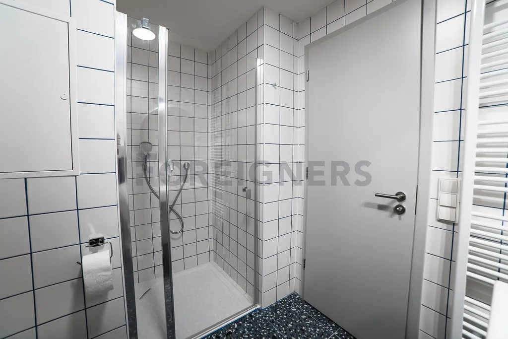 Koupelna je vybavena umyvadlem, zrcadlem, WC, sprchovým koutem, úložným boxem, ventilátorem a topným žebříkem.