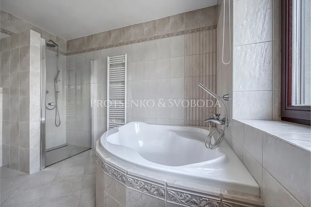 Tři prostorné pokoje (ve dvou jsou vestavěné skříně), samostatná šatna/pracovna a velká koupelna s rohovou vanou, sprchovým koutem, dvěma umyvadly, WC a bidetem. Podlahy jsou plovoucí dřevěné, vytápění je zajištěno hliníkovými radiátory. Z chodby je vstup na střešní terasu (65 m²), která navazuje na balkon (21 m²) orientovaný na jih.