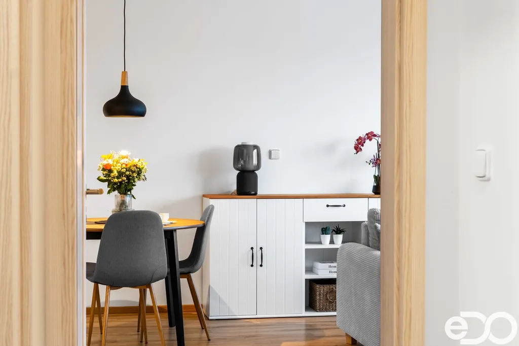 Byt se nachází ve 3. nadzemním podlaží a má podlahovou plochu 62,8 m². Dispozice zahrnuje obývací prostor s kuchyní a přímým vstupem na balkon o velikosti 1,6 m². Otevřený a vzdušný charakter obývacího pokoje s kuchyňským koutem umožňuje kromě obývací sestavy pohodlně umístit i pracovní kout nebo knihovnu. Kuchyňská linka je vyhotovena na míru v černo-dřevěném dekoru a osazena spotřebiči Bosch. K bytu dále náleží sklepní kóje o velikosti 2,2 m². Vybavení bytu může zůstat dle dohody.