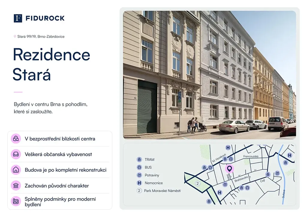 Jedna z nejžádanějších adres v centru Brna – klidná ulice Stará se nachází jen pár minut chůze od náměstí Svobody, hlavního nádraží, nebo OC Vaňkovka.