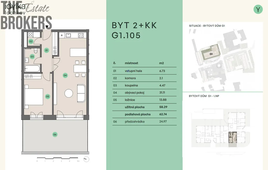 Byt je situován v 1. nadzemním podlaží a nabízí podlahovou plochu 62,74 m² doplněnou o západně orientovanou předzahrádku o velikosti 24,97 m², která poskytuje ideální prostor pro relaxaci, posezení či trávení volného času na čerstvém vzduchu.