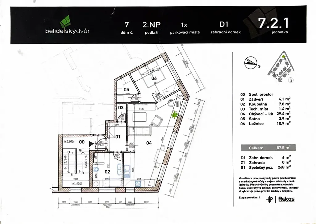 Užitná plocha bytu činí 57,5 m2 a dispozičně je velmi dobře řešený: ze zádveří je vstup do obývacího pokoje s kuchyňským koutem a jídelnou o výměře téměř 30 m2, ložnice má svoji vlastní šatnu, v bytě je další úložný prostor v podobě technické místnosti a také velká koupelna se sprchovým koutem. K bytu dále náleží vlastní zahradní domek pro uskladnění všeho potřebného. Pro komfortní parkování bude novým nájemníkům sloužit vlastní parkovací místo přímo u domu.