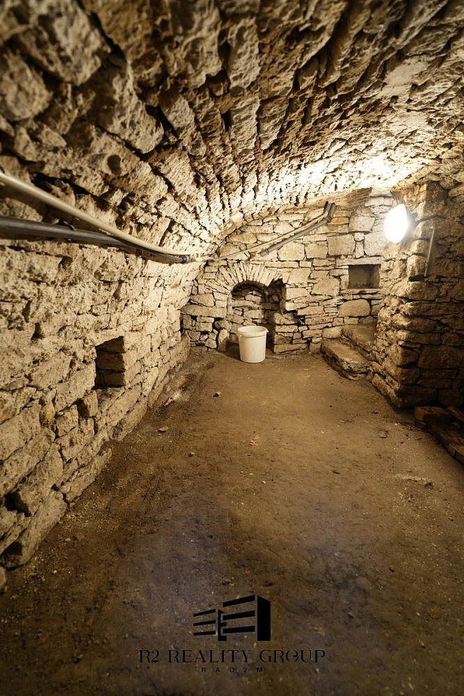 Obývací pokoj (21,2 m²) a kuchyně (12,2 m²) jsou dominantou obytné části. Vedle kuchyně je komora (6,3 m²) se vstupem do sklepa o ploše 8 m². Dále pak záchod (1,7 m²), prostorná koupelna (8,3 m²) a další komora (2,7 m²).