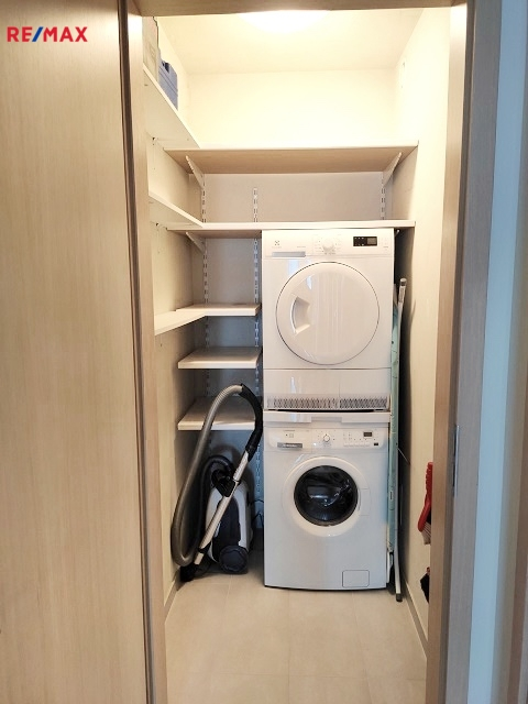 Byt má koupelnu s vanou a toaletou, dále samostatné WC a praktickou komoru s pračkou a sušičkou. Komfort bydlení zvyšuje klimatizace.