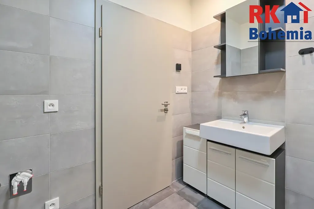 V koupelně se nachází sprchový kout, umyvadlo, koupelnové skříňky, zrcadlová skříňka s poličkami, WC a příprava na pračku a sušičku.