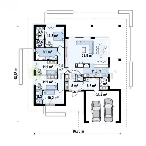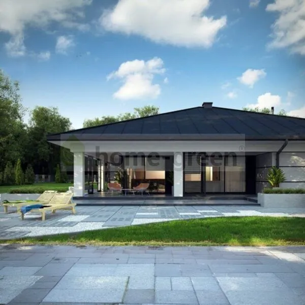 Doporučujeme na tomto pozemku postavit moderní přízemní dům Z378 s garáží pro dvě auta. Interiér domu je rozdělen na obývací a spací část. Prostorný obývací pokoj, který je propojen s elegantní jídelnou, je vybaven krbem, který zajišťuje, že váš domov bude vždy naplněn teplem domova. Kuchyňský kout je vybaven velkým množstvím pracovních desek (kuchyňský ostrůvek), které ocení každý majitel domu. Rozlehlá terasa obklopující celý obytný prostor je vybavena velkými okny pro maximalizaci vnitřního světla. Blízkost koupelny umožňuje hostům zůstat v obývacím prostoru. Ložnice se skládá ze čtyř pokojů, z nichž poslední má samostatnou koupelnu a šatnu, takže ji lze využít jako pokoj pro hosty nebo jako hlavní ložnici. Dva prostřední pokoje mají společnou koupelnu na chodbě, zatímco pokoj s výhledem do ulice má vlastní koupelnu. Návrh domu Z378 vznikl jako reakce na potřeby rodin se třemi dětmi.