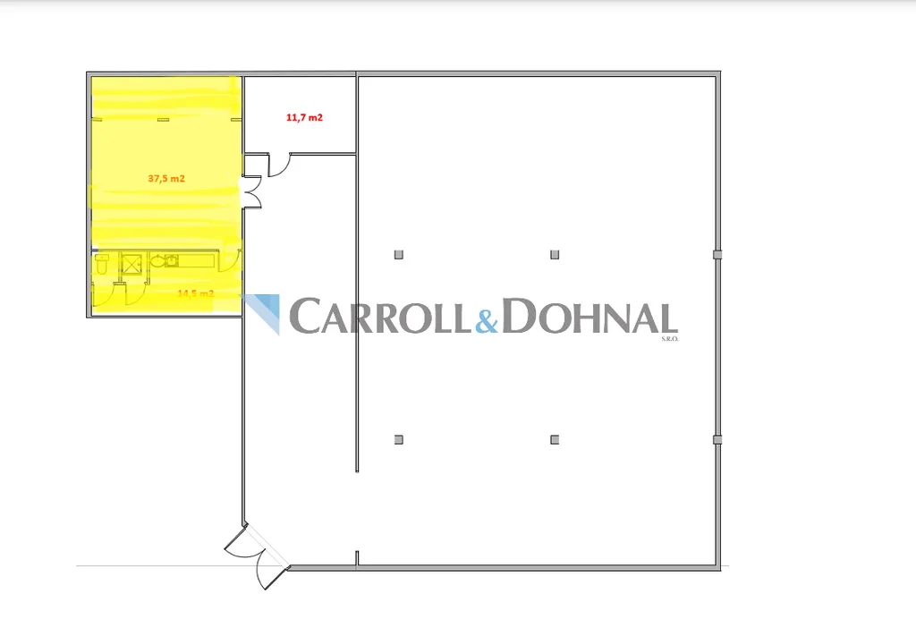 V půdorysu je prostor vyznačen jako místnost o velikosti 37,5 m, doplněná o kuchyňku a sociální zařízení o výměře 14,5 m.