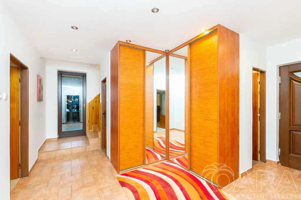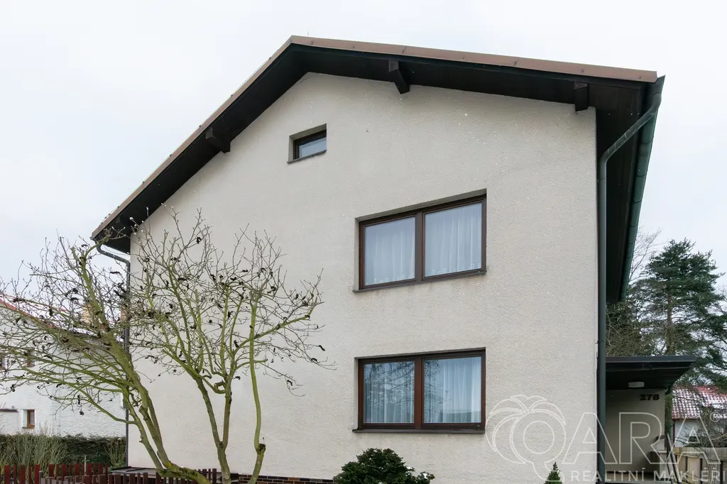 Přízemí domu nabízí prostorný obývací pokoj s jídelnou, kuchyni, halu, toaletu a komoru. V patře se nachází tři velké ložnice a koupelna s vanou i sprchovým koutem. Součástí domu je garáž s dílnou a technické zázemí.