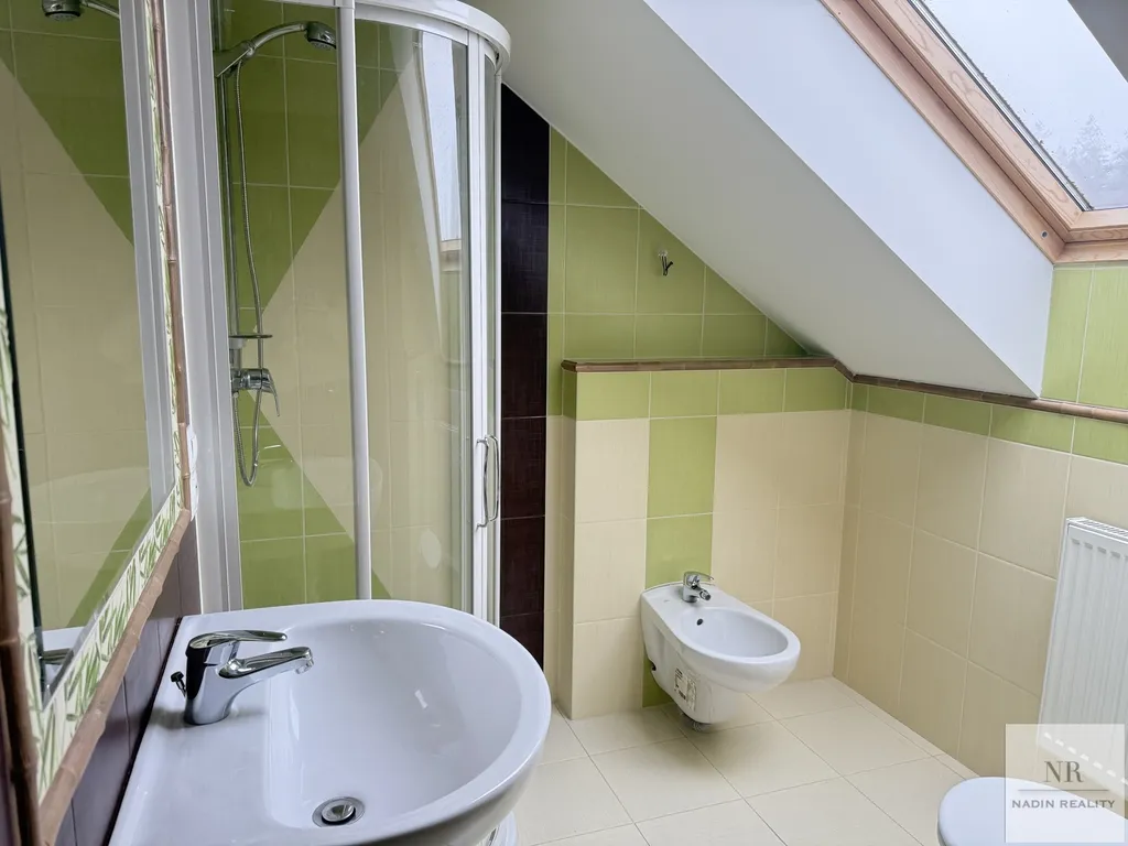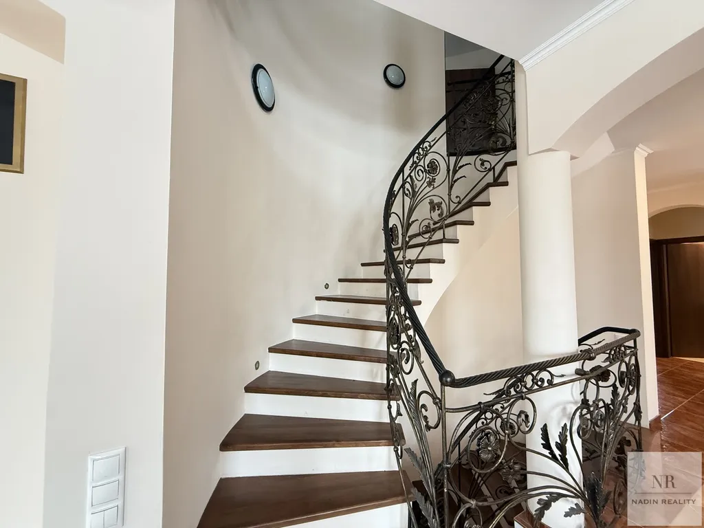 Interiér domu je navržen s důrazem na eleganci a praktičnost. V přízemí se nachází prostorný obývací pokoj s krbem a TV koutem, jehož součástí je vstup na terasu a do zahrady. Dále zde naleznete jídelnu, plně vybavenou kuchyni, pracovnu, ložnici, koupelnu a toaletu. V 1. patře se nacházejí tři ložnice a dvě koupelny, které jsou ideální pro rodiny, které touží po soukromí a pohodlí.