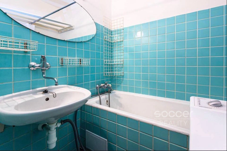 Koupelna je s vanou, WC je samostatné. K bytu náleží sklepní kóje v suterénu domu o velikosti cca 2 m². V mezipatře je k dispozici společný balkonek.