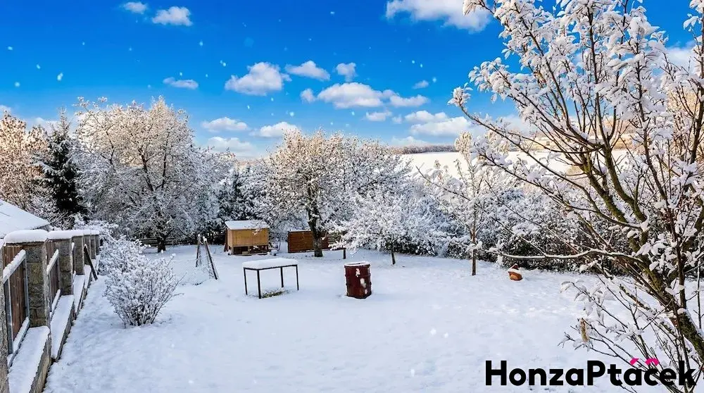 Zahrada nabízí dostatek prostoru jak pro odpočinek, tak pro pěstování nebo drobný chov. Terasa s bazénem zve k letnímu posezení a k dispozici je i příprava na plánovanou saunu. Dům je téměř dokončen, chybí jen drobnosti – například instalace venkovních svítidel nebo finální nátěr fasády Odhad investice k dokončení je cca 300.000 Kč.