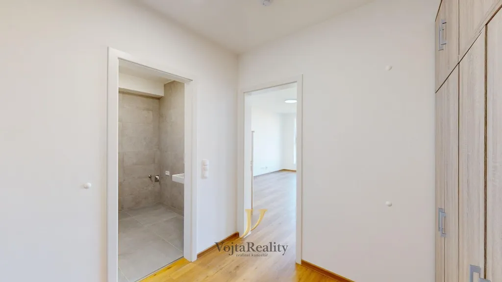 Byt je rozdělen na čtyři části, a to předsíň vybavenou skříněmi a věšákem na kabáty, koupelnu se sprchovým koutem a přípravou na pračku a sušičku. WC je součástí koupelny.