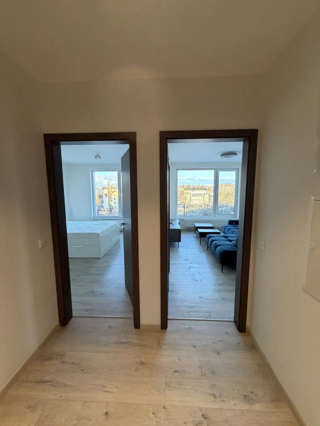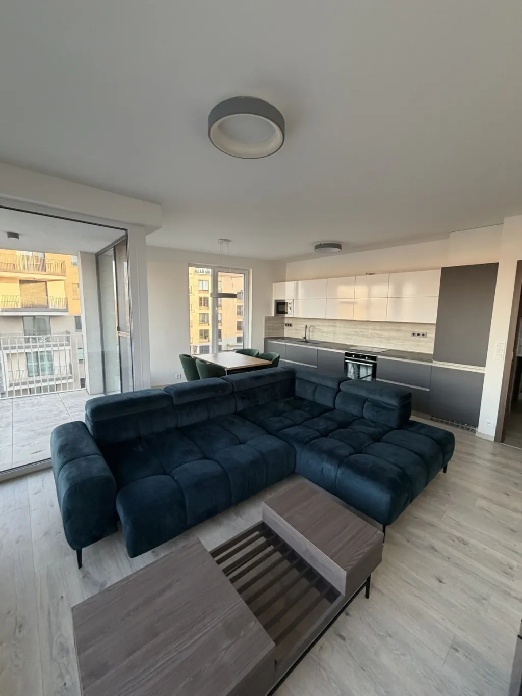 Veškeré vybavení bytu včetně interiérových dveří a plovoucích podlah je zcela nové. Velké okna zaručují dostatek přirozeného denního světla.