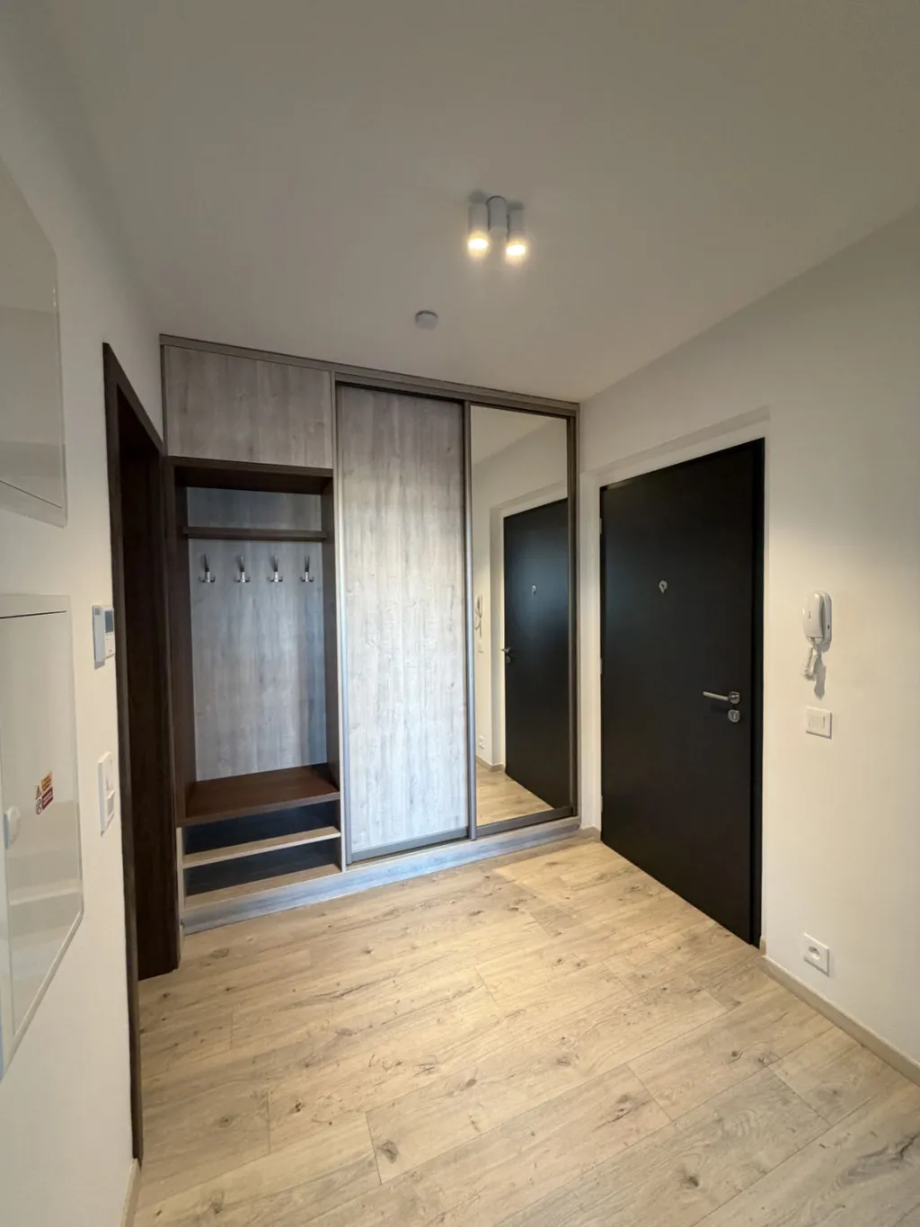 V prostorné předsíni je praktická vestavěná skříň s dostatkem úložného prostoru a zrcadlem. Z předsíně je vstup do všech místností - koupelny, obývacího pokoje s kuchyní a ložnice, ve které je také vestavěná šatní skříň. V obývacím pokoji s kuchyní je na míru zhotovená kuchyňská linka s vestavěnými spotřebiči - lednice s mrazákem, myčka, mikrovlnná trouba, elektrická trouba, indukční varná deska, digestoř, nechybí ani integrované osvětlení pracovní desky a designové svítidla. Z obývacího pokoje je vstup na rohovou lodžií.