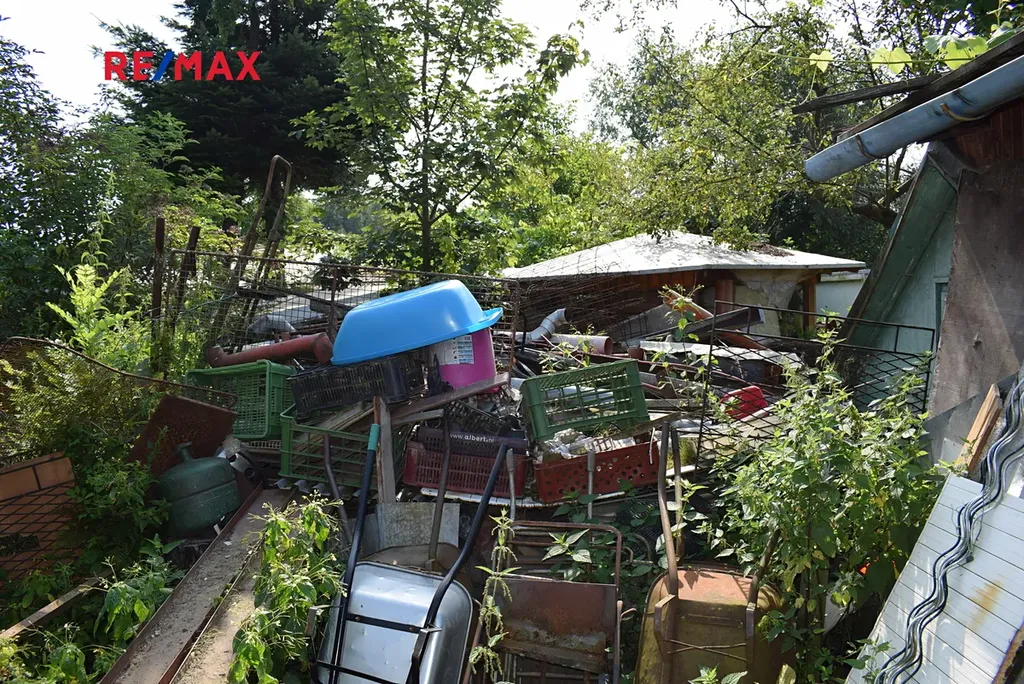 Na dvoře jsou dvě zděné garáže, dřevěné kůlny s dílnou, skleník a na konci zahrady je chatka s ubytováním....