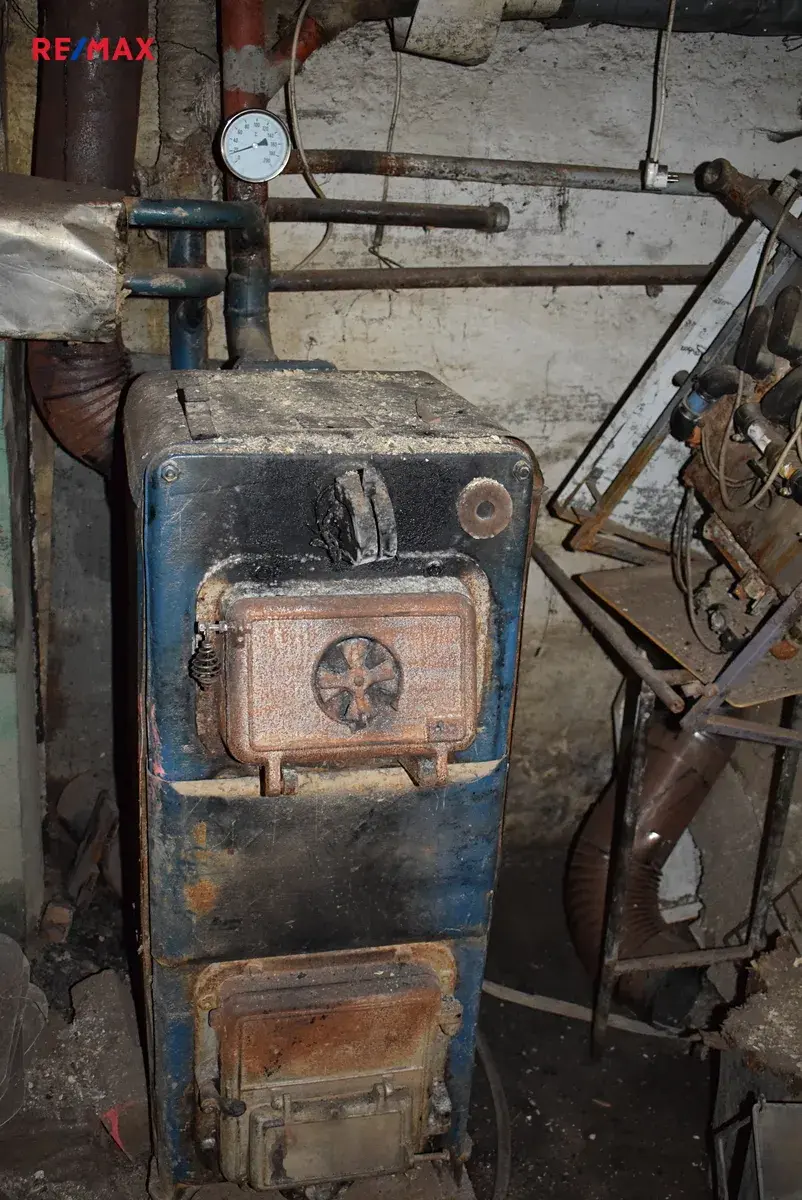 Ve sklepě je kotel na tuhá paliva a přívod plynu.