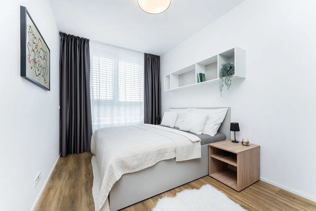 Byt se skládá z ložnice a obytné místnosti, kde naleznete plně vybavenou kuchyni včetně spotřebičů, pohodlnou pohovku a televizor. Nerušený odpočinek zaručuje pohodlná postel s kvalitní matrací, kterou naleznete v oddělené ložnici. Pro větší pohodlí Vám navíc nabízíme dvě varianty jejího uspořádání – dvoulůžko nebo dvě oddělené postele pro spolubydlení. Samozřejmostí je i moderní koupelna se sprchovým koutem a pračkou.