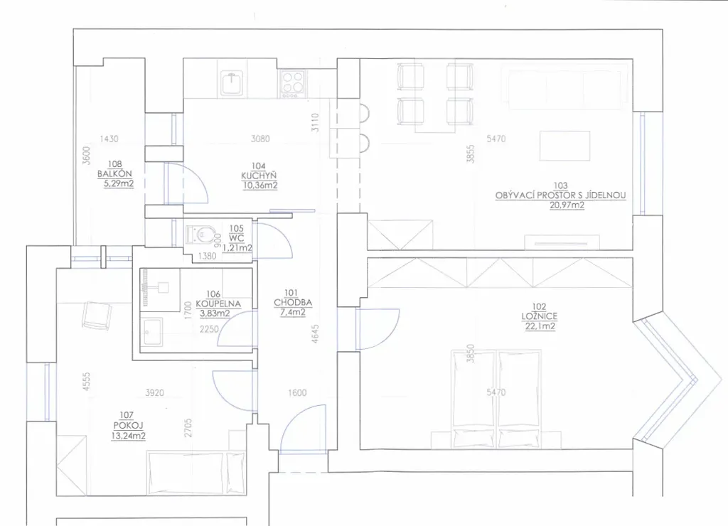 Byt se nachází ve 3.NP bez výtahu, má tři pokoje a kuchyňský kout, WC je řešeno samostatně.