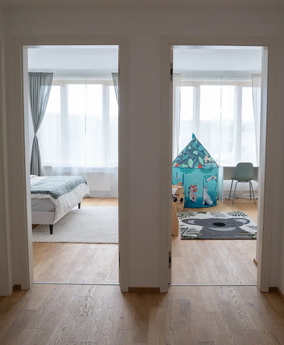 Byt nabízí dvě ložnice, obě s přímým vstupem do prostorné šatny. K dispozici jsou dvě koupelny – jedna s vanou, umyvadlem a toaletou, druhá se sprchovým koutem a umyvadlem – a dále samostatné WC v předsíni. Celý interiér je řešen tak, aby působil vzdušně, klidně a funkčně, s dostatkem úložných prostor včetně šatny, chodby a zádveří.