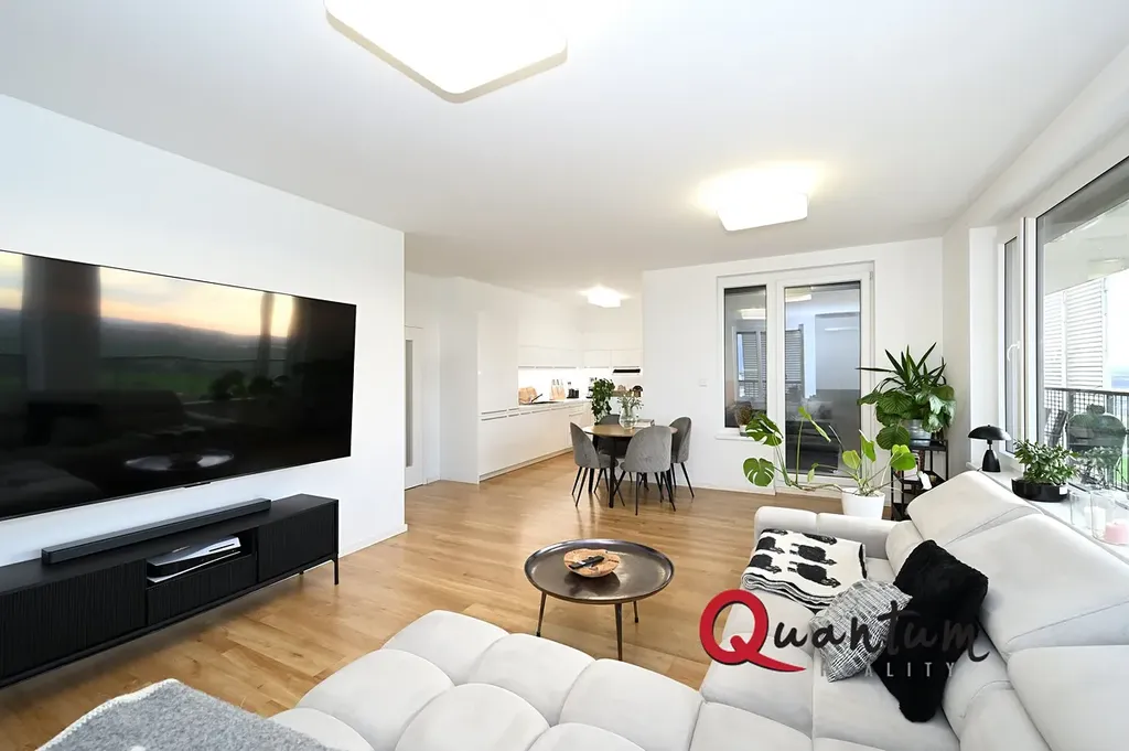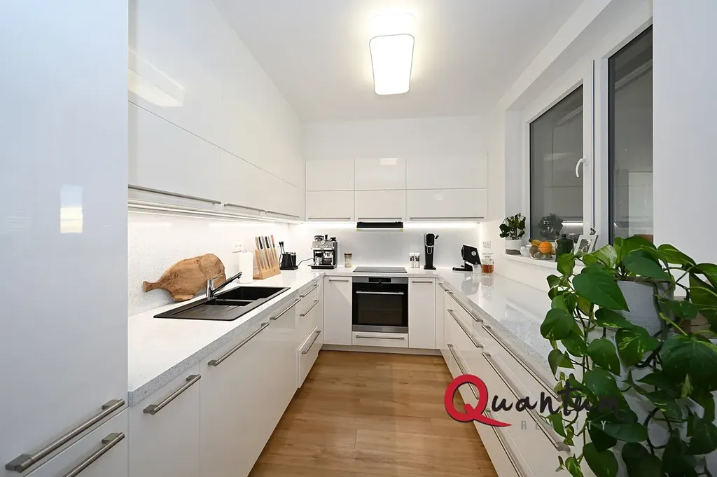 Byt je nabízen nezařízený (vybavení na fotografiích patří současnému nájemci). Dispozice zahrnuje tři neprůchozí ložnice, prostorný obývací pokoj se vstupem na rozšířenou terasu, kuchyňský kout s kuchyní Hanák a vestavěnými spotřebiči (indukční varná deska, elektrická trouba, myčka nádobí, lednice s mrazákem).