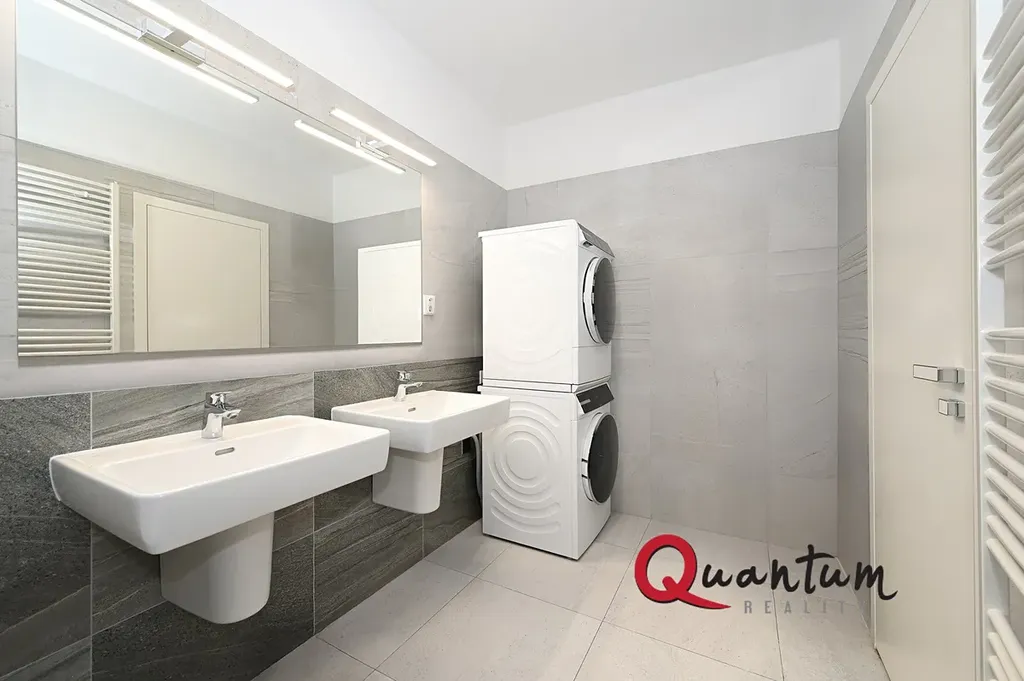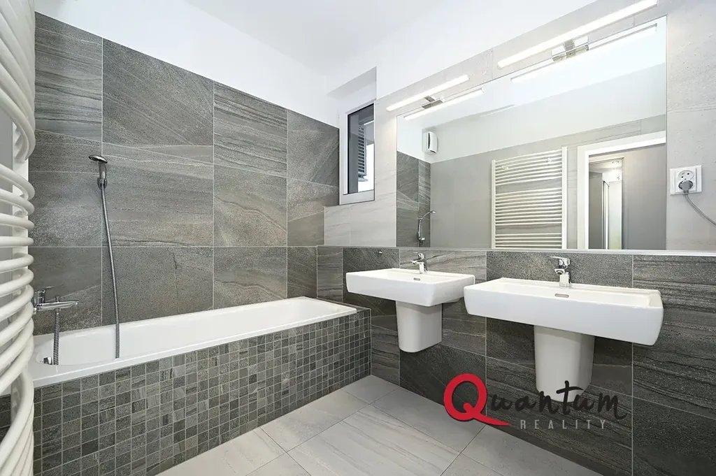 K dispozici jsou dvě koupelny – jedna s vanou, druhá se sprchovým koutem a WC, dále samostatné WC a menší komora v bytě.