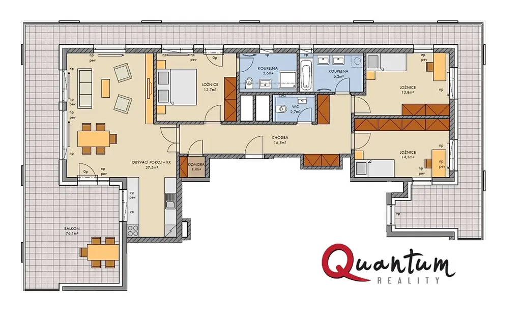 Ve všech pokojích je instalována klimatizace, plastová okna jsou vybavena elektrickými předokenními žaluziemi. Podlahy jsou dřevěné a z dlažby, v chodbě se nacházejí vestavěné skříně. Terasa je přístupná ze všech pokojů a je orientována na tři světové strany – sever, východ a západ.