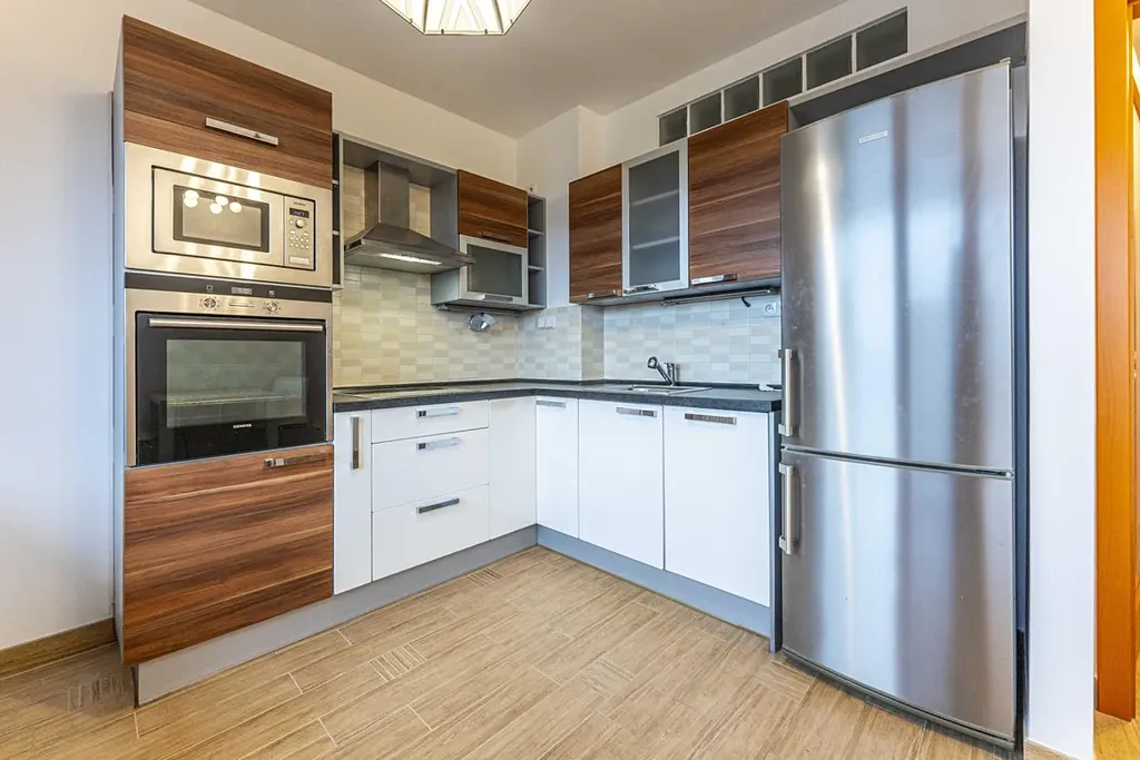 Je zařízený několika kusy nábytku jako je velká skříň v obytném pokoji, několik dalších kusů nábytku (vizte na fotografiích). Kuchyň je vybavena běžnými spotřebiči: keramická varná deska, trouba, mikrovlnná trouba, myčka a lednice s mrazákem.