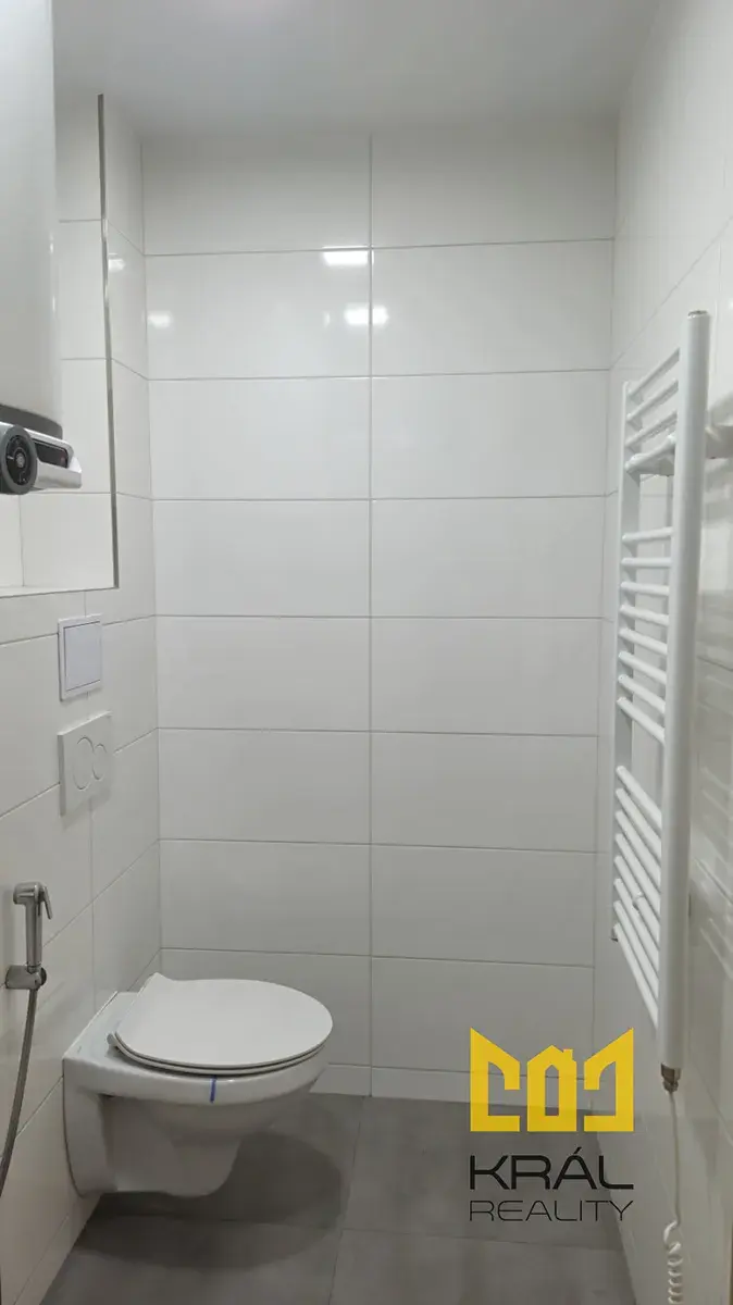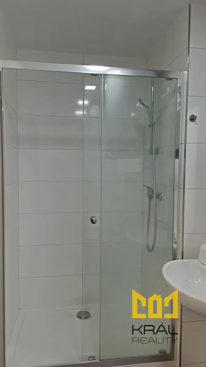 Koupelna se sprchovým koutem, WC, žebřinové topné těleso, umyvadlo, zabudované zrcadlo, elektrický boiler.