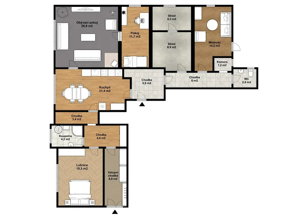 Dispozice 4+1 + sklady a místnosti pro úložný prostor