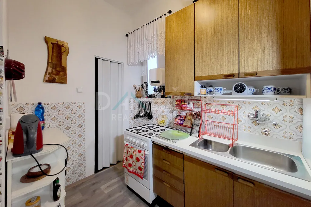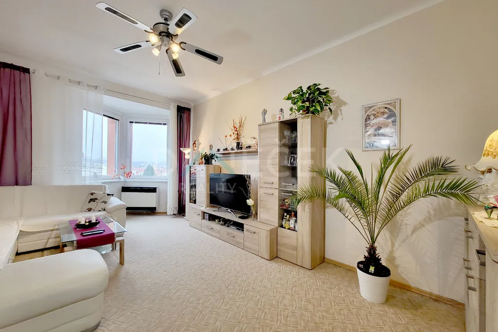 Po vstupu do bytu se otevře prostorná chodba, z níž se dostanete do všech místností. Obývací pokoj vás přivítá světlem a příjemnou atmosférou. O tu se stará cihlový krb v rohu, který dělá z této místnosti srdce celého bytu. Ať už chcete posedět s knihou nebo si vytvořit relaxační atmosféru při práci, tady to půjde samo. Ložnice působí jako klidová zóna – dřevo, světlo, teplé tóny a výhled na město. Je to prostor, kde se snadno vypnete po celém dni. Kuchyň je jednoduchá, praktická a útulná, ideální pro vaření bez chaosu.