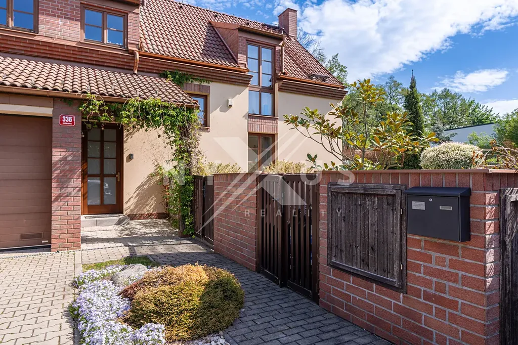 Elegantní dvoupodlažní dům v anglickém stylu stojí uprostřed rovné zahrady se vzrostlými stromy a keři, nechybí ani různé druhy těch ovocných. Pěstěný trávník udržuje automatická závlaha, zahradní technika je uskladněna v samostatném zahradním domku. Velký pozemek nabízí mnoho dalších využití, jako je například vybudování zimní zahrady, sauny, bazénu či rozšíření domu.